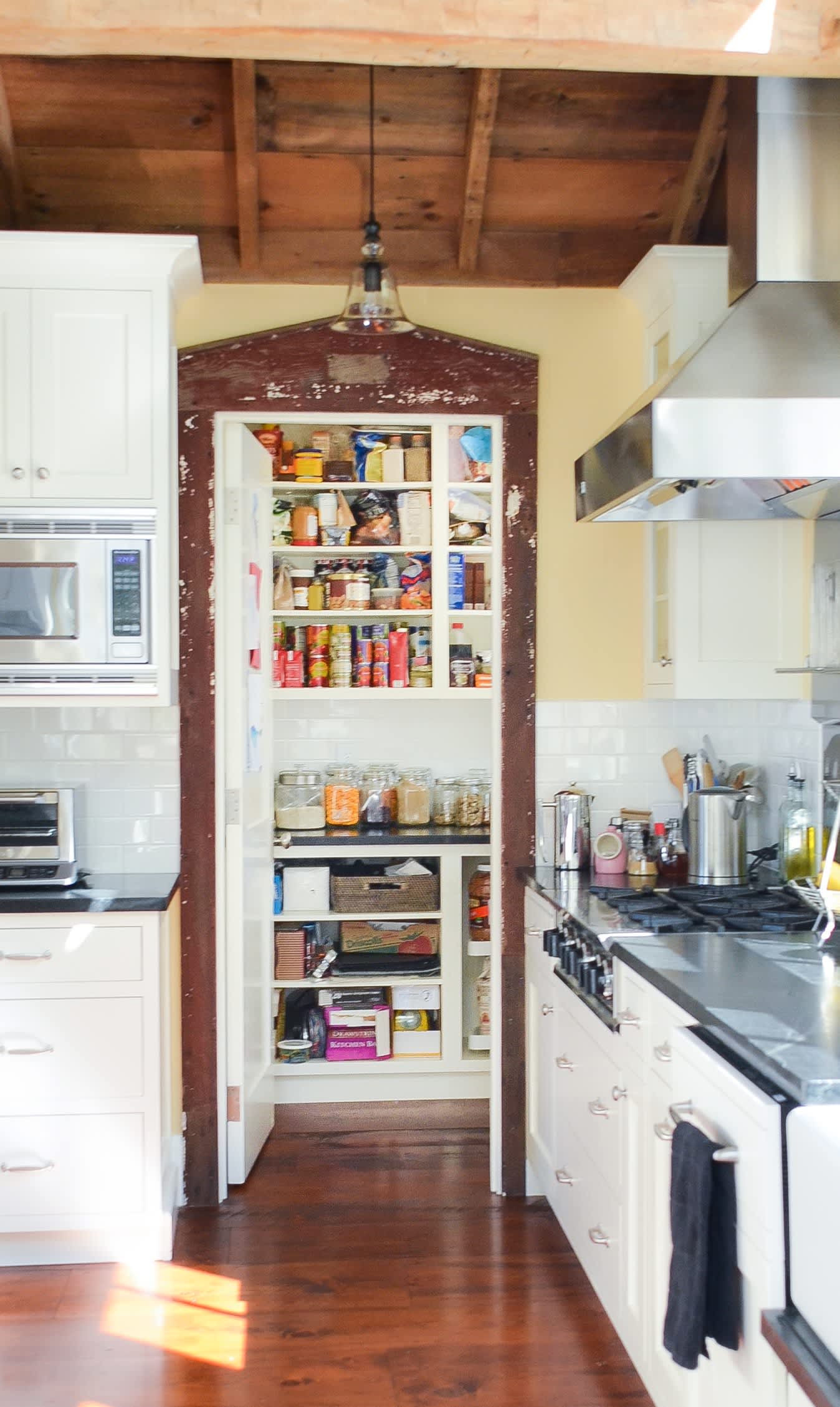 This may look like a conventional wardrobe closet, but open its doors and an impressive amount of freestanding pantry. This open, sunlit family kitchen in ohio has scads of cabinets, but the open shelving is tucked away behind a door. If you don't have a dedicated pantry space, carve one out by putting open shelving over another piece of furniture like a short cabinet. Yet an open pantry can work really well for cooks who like to have ingredients and small appliances at arm's length yet still appreciate a stylish kitchen.