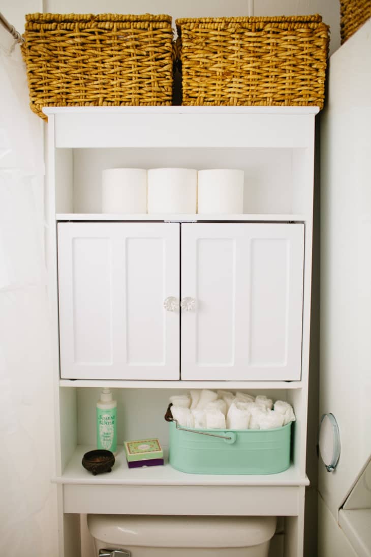 It didn't take us long to add one! The toilet can be used as a step ladder for easy access. An adjustable shelf behind the spacesaver's doors allows tall bottles to be stored. It didn't take us long to add one!
